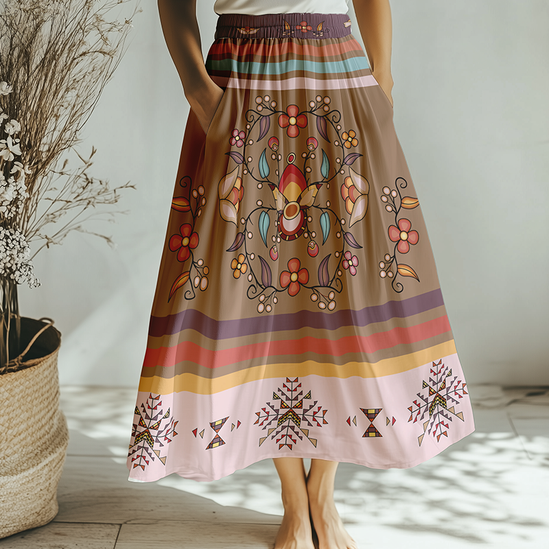 Our ankle-length skirts are designed with comfort, practicality, and Indigenous beauty in mind. Featuring a wide elastic waistband for a flattering and flexible fit, plus pockets (yes, real pockets!), these skirts are as functional as they are stunning. You can pick from two choices of fabric.