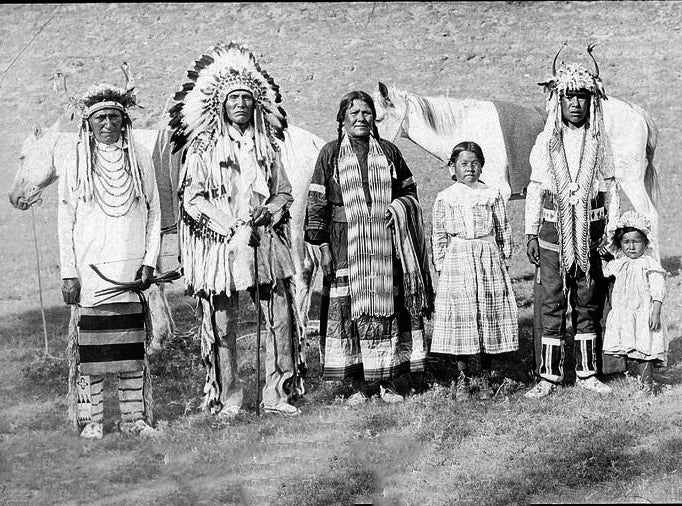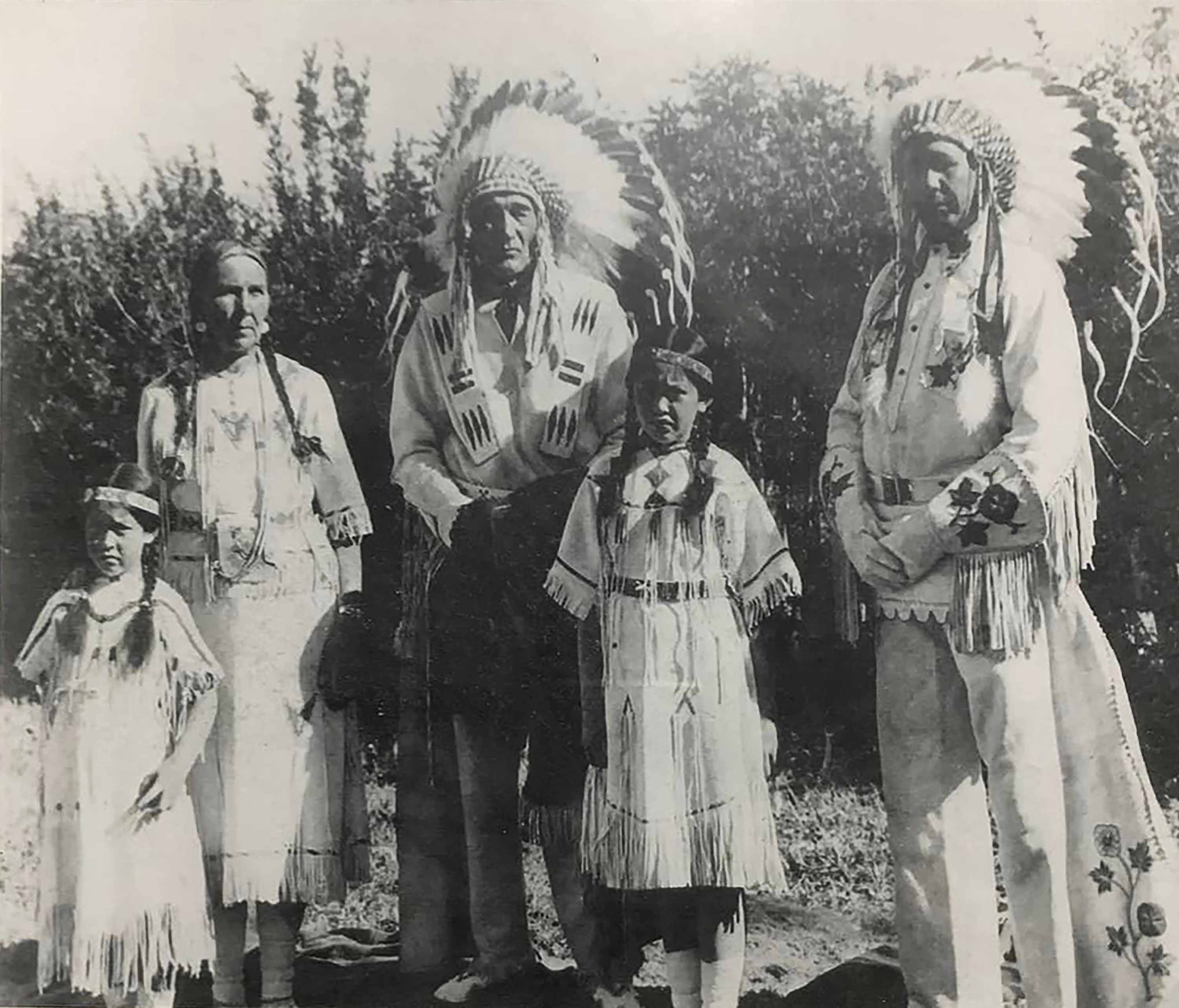 Double Gun Woman (aka Mary Iron Pipe) was the daughter of Chief Iron Pipe, and the mother of Rosie Davis. Here, she and her second husband, Joe Healy (aka Wolf Moccasin), are posed with their children in Lethbridge, AB near Fort Whoop Up. Joe Healy was an interpreter for Head Chief Red Crow, and was one of the only Blackfoot men of his age group who spoke English. Joe and Double Gun Woman went on to have a large family, which now includes over 3,000 descendants scattered across Canada, the United States, and other parts of the globe.