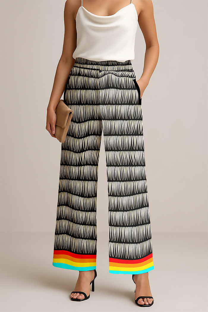These silky soft satin pants mimic a ribbon skirt with colorful bands on the legs. They have beautiful inset pockets and a nicely sewn thick elastic waist for comfort and durability. You'll wish you had every design.